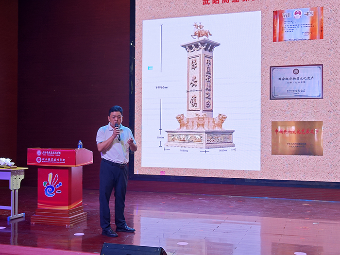 讲座伊始,尹国安大师以自身经历为切入点,向师生们讲述了自己与石雕技艺相伴数十年的历程——从初入行业时对石雕的好奇与探索,到深耕多年后对技艺的敬畏与坚守,再到如今肩负非遗传承使命的责任与担当。随后,他聚焦大冶尹解元石雕这一地方文化瑰宝,详细梳理其自明清时期传承至今的厚重历史:从早期服务于建筑装饰的实用雕刻,到逐步形成兼具审美与文化内涵的艺术风格,再到如今入选国家级非遗名录的发展脉络,让在场师生深刻感受到传统技艺背后的文化底蕴与时代价值。