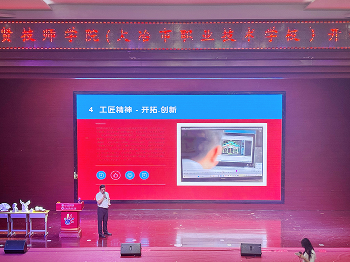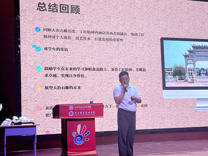 谈及石雕技艺与工匠精神的融合,尹国安大师感慨道:“每一块石头都有自己的纹理,每一件石雕作品都需要工匠用心对话。”他表示,石雕不仅是手艺的展现,更是匠心的传递,只有将“精益求精”的态度融入每一次凿刻,才能让冰冷的石头拥有温度与灵魂。同时,他回顾大冶石雕行业的发展历程,指出正是一代代工匠坚守工匠精神,才让这门技艺历经风雨却愈发鲜活,也印证了工匠精神对个人成长(打磨技艺、提升素养)、技艺传承(延续文化根脉)、行业发展(推动产业升级)的关键作用。最后,他对学子们寄予厚望:“希望你们在新学期里,以工匠精神为指引,认真学好每一门课程、练精每一项技能,在未来的职业道路上,既要有‘择一事终一生’的专注,也要有‘破万卷行万里’的创新,用技能实现自身价值,为行业发展贡献力量。”